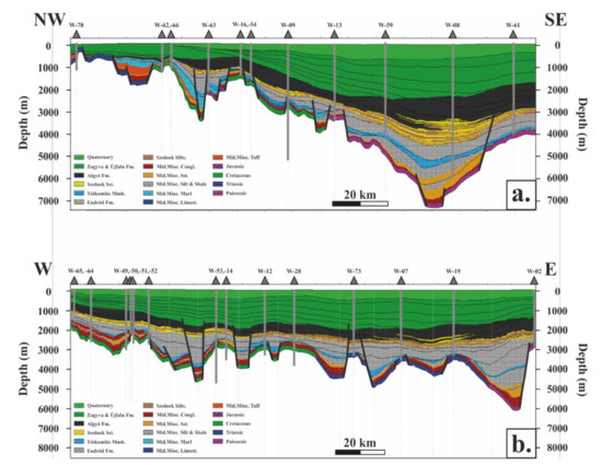The geological, geophysical, and reservoir mechanical parameters have been incorporated into the 2D basin models during the model building phase [64] that was carried out with the Schlumberger PetroMod software (version 2017.1). Moreover, recently published calibration models have been added to the Calibration Editor. The main purpose of the 2D basin modeling studies focus on the better understanding of the hydrocarbon systems or providing a more adequate regional overview [65,66,67]. This study delivers an alternative usage in case of 2D basin models; the original concept was to extend the application of basin modeling in the field of engineering sciences. Depth-converted seismic horizons delivered the timeframe and the sedimentation rate to the simulated geological sections that starts from the deposition of the Middle Miocene. The seismic horizons have been correlated from magnetostratigraphic absolute age well picks [68,69,70,71,72,73]. The continuous sedimentation has been interrupted three times by discordance surfaces. The amount of eroded strata thicknesses is variable along the sections, but both have been integrated into the numerical simulations. The layers between the depth horizons consist of more lithofacies, because the sedimentation has been controlled by a prograding delta series from the Late Miocene (Figure 8). Twelve layers have been separated during the model building phase; the layers consist of 5 to 20 sublayers due to the lithological heterogeneities within the prograding delta series (195 sublayers). The direction of Section_01 is parallel with the sediment transport direction and 168 km long, but the Section_01A is perpendicular to the sediment influx with 189 km total length. The delineation of lithofacies is relied on the evaluation of the lithology-sensitive well logs and the identified clinoforms [28]. One lithofacies has been attached to every Late Miocene and younger formations; only the prodelta turbidites (Szolnok Fm.) have been divided into two parts (shaly siltstone and silty sandstone) with the calculated shale volumes. A unique porosity-effective stress trend has been assigned to every lithofacies, and a poroperm trend has been fitted to the compaction trends that are consistent with the measured permeability data (Hg saturated, Nano-K).