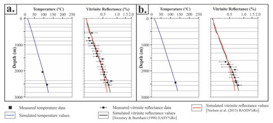The simulation of the basin models is a multi-phase iterative process that aims to reduce the difference between the simulated and the measured parameters. At least four recommended parameters must be involved in the calibration (pore pressure, porosity, temperature, and maturity) [48]. The calibration has a logical order that starts with the pore pressure, because it determines the effective stress, which controls the porosity. The porosity affects the total volume of the pore fluid in the rock matrix, so the higher the water volume, the slower the warming of the layers, due to the high heat capacity of the water. Finally, the lower temperature results in slower maturity and hydrocarbon generation. The temperature and the maturity calibration are also important from the pore pressure prediction point of view, because the chemical compaction as an overpressure generation mechanism is controlled by the temperature. Moreover, the hydrocarbon generation and cracking are driven by the thermal maturity and the temperature, so the complete calibration workflow has been carried out. Temperature values were acquired from DST, and the core-based vitrinite reflectance data have been used as maturity proxy (Figure 9). The calibration process was supplemented with the bulk density, because the lithostatic pressure originated from the bulk density, when vertical stress is the highest. The bulk density logs have been upscaled to 10 m spacing. The difference between the lithostratigraphic pressure and the pore pressure creates the effective stress that controls the mechanical compaction and the permeability reduction within the sediments.