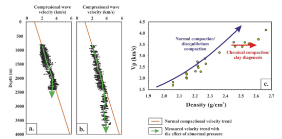 Chemical compaction and the unloading mechanisms have been evaluated on the Vp-Den cross plot [56]; the effect of unloading has not been proved on the cross plots, but only in case of two wells have been evaluated. The chemical compaction could be present due to the identified sharp bulk density increase (Figure 10). The density starts increasing at 105–110 °C, which could be explained by the smectite–illite transformation [56].