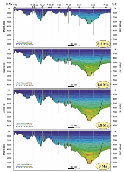 Section_01 is parallel to the direction of the sediment influx, so it is more representative from the pressure regime development point of view (Figure 11). According to the results of Section_01, the abnormal pressure regime could have formed 9.2 Ma ago, when the subbasins were buried rapidly. Overpressure was increased continuously in the subbasins until the Late Miocene–Pliocene boundary, but the magnitude of generated overpressure differs in case of the subbasins. The NW part of Section_01 was uplifted at the Late Miocene–Pliocene boundary, and the burial of the north western parts has been stopped. The southeast part of the section subsided during the Pliocene that resulted in the increase of overpressure. The subsidence stopped 2.58 Ma ago at the Pliocene–Quaternary boundary that resulted in the decay of the overpressure, because the pore fluids could slowly leave the pore space. The subsidence has continued in the Quaternary, so the increased overburden stress has triggered again the overpressure generation.