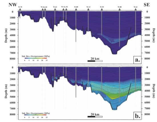 The calibrated but deterministic best-case models have been supplemented with an enumerative Monte Carlo-based approach to evaluate the effects of the above uncertainties. The permeability and depth are treated as probability variables. Uniform distribution was assumed in case of the permeability (Schlumberger verbal communication), and the laboratory-measured dataset suggested a ±1 magnitude logarithm of dimensionless permeability (before normalization, it is originally given in mDarcy) variance for every porosity interval. The depth has been handled as a probability variable only in case of shale-rich layers, so that was the input of the Monte Carlo simulation. Normal distribution with ± 20% standard deviation (compared to mean values) has been considered in case of depth horizons uncertainty [80]. The combination of Monte Carlo simulation and basin modeling has resulted in stochastic pore pressure and overpressure models, where the standard deviations has been calculated next to the minimum, maximum, and average pressure values.