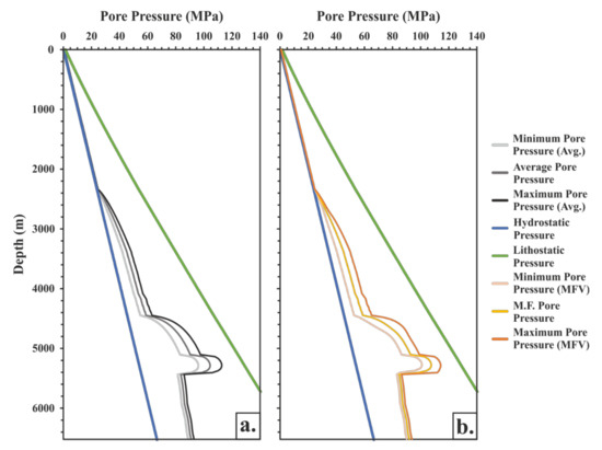 The stochastic pore pressure models delivered a predicted pore pressure interval along the simulated sections that was calibrated to the existing well data. According to the sensitivity analysis, the depth uncertainty has only a minor effect on the subsurface pressure regime, because it is produced only a 3.8 MPa standard deviation, which means 8–11% uncertainty in the simulated pore pressure values. However, the permeability uncertainty was one magnitude higher, 17.1 MPa absolute or 34% relative overpressure differences (Figure 12).