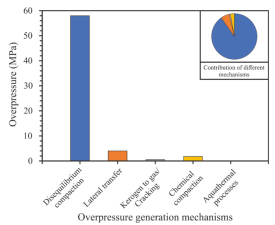 The contributions of overpressure generation mechanisms have been studied in the Carnarvon Basin [100], where the main abnormal pressure generation mechanism was the under-compaction. According to the study, the hydrocarbon generation, the chemical compaction, and the fluid expansion mechanisms has only a minor impact on the subsurface pressure conditions, so the under-compaction had one magnitude order higher impact. Effect of the lateral transfer has not been incorporated in the Carnarvon Basin study. The two most important overpressure generation mechanisms are the disequilibrium compaction and the lateral transfer in case of the study area. Hydrocarbon generation and chemical compaction have been identified as minor phenomenon with local pore pressure anomalies mainly in the basin centres. According to the numerical simulations, the under-compaction makes one order of magnitude higher impact on the overpressure values than other identified mechanisms. The results of the basin simulation indicate that the absolute maximum contribution of the unique mechanisms: under-compaction 58 MPa, lateral transfer 4MPa, chemical compaction 1.8 MPa, and hydrocarbon generation and cracking 0.5 MPa (Figure 15).
