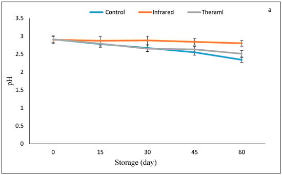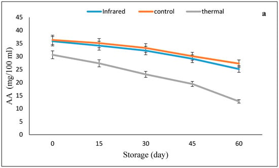 The results showed in Figure 3a a decrease in the amount of ascorbic acid when stored for 60 days at a temperature of 5 °C, as the percentage of decrease was 24.90%, 29.75%, and 58.31% in the control sample, the infrared treated juice samples, and the thermal samples (conventional), respectively. These results were consistent with the findings of Mohamed et al. [37] who indicated the inability to retain a higher amount of ascorbic acid in fruit juice during storage depending on storage conditions such as temperature, oxygen, and light. The results of the statistical analysis indicated that there were significant differences between samples of juice treated with infrared radiation compared to samples of control and thermal samples (conventional), as the results showed that the amount of ascorbic acid in samples of fresh juice was higher compared to the infrared treated juice samples and the thermally treated samples (conventional). The results of the statistical analysis also indicated that there was a significant difference (p < 0.05) between the control sample and thermal treated samples (conventional). This is confirmed by the results obtained by Torres et al. [38] which indicates that the use of moderate heat treatment during the manufacturing process of juices be able to reduce the loss in the amount of ascorbic acid because it is characterized by being an unstable compound.