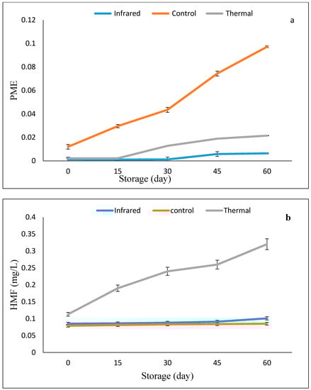 Figure 4b shows the hydroxymethylfurfural content of juice samples stored at 5 °C for a period of 60 days. The results obtained show that the quantity of HMF ranged between (0.0852–0.101) mg/L for juice samples treated with infrared radiation, while the quantity of HMF ranged from (fresh) control samples and the thermally treated samples (0.079–0.085) and (0.0113–0.32) mg/L, respectively. It was noted from the results that the amount of HMF in all juice samples gradually increased during the process of cold storage at a temperature of 5 °C for 60 days. These results are in agreement with Randhawa et al. [50] who indicated that the main reason for the accumulation of HMF during storage may be due to the degradation of ascorbic acid, as was observed by other scientists in citrus juice concentrates [50,51].