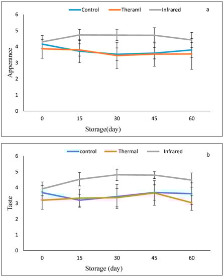 The results of the sensory evaluation are shown in Figure 5, which indicated that there was no significant difference (p > 0.05) between the thermally treated samples and the control sample with regard to the attributes of appearance, taste, and overall acceptability, respectively. Whereas, the results of the statistical analysis showed that there was a significant difference (p < 0.05) between the thermally treated samples and the control sample with respect to the aroma attribute Figure 5. The results of the statistical analysis also showed that there are significant differences between the infrared treated samples and the thermal treatment samples and the control sample for all studied attributes. These results indicate physical, chemical, or microbial changes in the stored juice samples that were reflected on the scores of evaluation previously given. The taste panelists gave scores to the infrared-treated juice samples, which were close to the control sample directly after the production process. This result of the sensory evaluation was in agreement with Rawson et al. [56] and Alothman et al. [57] who stated that the infrared irradiation of food products may cause minimal modification in the flavor, color, nutrients, taste, and other quality attributes.
