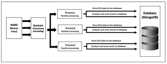 To facilitate the collection, management, and analysis of ECG data, we built a data processing system that consists of a frontend and a server. The server, based on Alibaba Cloud, was designed with flask as its framework, as depicted in Figure 1. We selected MongoDB as the database. Compared to the other relational databases, such as MySQL, MongoDB is more convenient for storing time series data. Whenever the frontend collects 10 s of ECG data, it sends that data to the platform through the 4G network. After the server receives the data, if necessary, three processes generated by Gunicorn are executed at the same time. To avoid data loss caused by the server analyzing prior ECG data when the new data arrive, the ECG data need to be stored. Each process thus starts with two tasks. Task1 is responsible for storing the data in the database and Task2 is responsible for analyzing the ECG and then storing the result in the same database. Thus, the server can store the data without interruption and also avoid data loss as much as possible. The frontend consists of an application for cell phones and sticker-type acquisition devices, the device is as shown in Figure 2. By using a cellphone to temporarily store and transfer data, we made the attachable ECG acquisition device as compact and lightweight as possible. The sticky acquisition device samples the ECG signals at a frequency of 250 Hz and continuously transmits the ECG signal via Bluetooth 4.0.