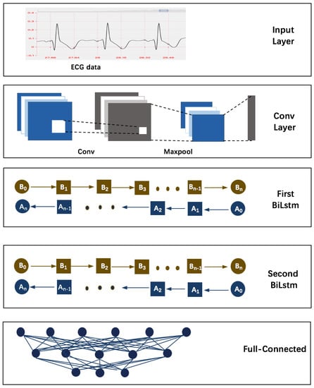 The excellent performance of CNN in the field of image processing is one of the most representative examples of deep learning. Due to the characteristics of weight sharing and local connection, CNN is good at extracting spatial and structural features. The number of nodes and parameters needed by a CNN network are exponentially lower. A typical convolutional neural network contains a convolutional layer and a pooling layer. The convolutional layer performs autocorrelation operations on the local data as intercepted by the window function and the convolution kernel, so that the features related to the convolution kernel is extracted. The number of features can be increased by increasing the number of convolution kernels in a certain range. To highlight the effective feature extraction and the decrease in time required for training, the pooling layer mainly downsamples the features generated by the convolution layer through either maximum sampling or average sampling. Considering the ability of the convolutional networks to extract spatial features, we added CNN to the first layer of the network to extract the structural characteristics of the ECG signals.