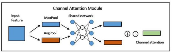 The convolutional block attention module (CBAM) [] is an effective attention module to use for convolutional neural networks. Instead of directly computing the attention map, CBAM infers the attention map along the channel and the spatial dimensions with the channel attention module and the spatial module as shown in Figure 5. In the channel attention module as Figure 6 showed, for the input feature in each channel, the average-pooled features and the max-pooled features are calculated simultaneously. Then, the MLP (Multi-Layer Perceptron) and sigmoid function are used to fuse the two features and generate channel attention map.