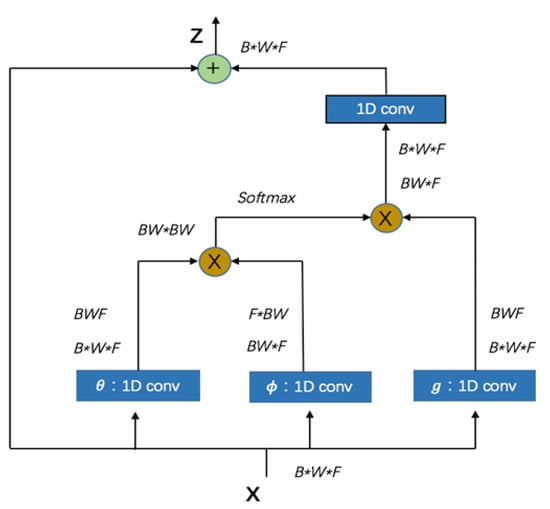 In the current article, i is the index of the length dimension generated by the convolutional layer, j is the index of the position in the length dimension related to i, x is the output of the last convolutional network, and y is the output that is the same size as x. A pairwise function f computes the response between i and all values of j. The unary function, g, computes an approximate local response of xj. C(x) is used for normalization. Compared with a fully connected layer for computing the relationship between xi and xj, the f function used in non-local neural networks is better able to reflect the non-linear relationship between xi and xj. We selected Embedded Gaussian as the f function and Softmax as the C function in Equation (1) as Equation (2) showed, where , and g represent a one-dimensional convolutional with different convolutional kernels. The final output Z is the sum of x and y as shown in Figure 8. The Value B in Figure 8 represents the size of the batch in this article, W represents the length of the ECG signal, and F represents the number of filters in the last convolutional network.