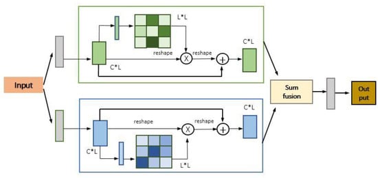 The dual attention network (DA-NET) [] used after CNN as an attention mechanism that can capture feature dependencies found in the spatial and channel dimensions. As shown in Figure 9, DA-NET contains two parallel attention modules. For the position attention module, a self-attention mechanism is introduced to capture the spatial dependencies between any two positions of the feature maps. For the channel attention module, a similar self-attention mechanism is used to capture the channel dependencies between any two channel maps. Then, a certain channel dependence is calculated by a weighted sum of all the channel maps. The weight is decided by the similarity between the corresponding two channels. Finally, the outputs of these two modules are fused by a summation and processed via a convolutional layer to generate the output of DA-NET.