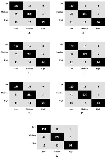 (A) The confusion matrix for the CNN (Convolutional Neural Networks)-BiLSTM (Bi-directional Long Short-Term Memory); (B) the confusion matrix of CNN (Convolutional Neural Networks)-attention-based BiLSTM (Bi-directional Long Short-Term Memory); (C) the confusion matrix of CNN-BiLSTM (Bi-directional Long Short-Term Memory) with CBAM (Convolutional Block Attention Module); (D) the confusion matrix of CNN (Convolutional Neural Networks)-BiLSTM (Bi-directional Long Short-Term Memory) with DA-NET (Dual Attention Network); (E) the confusion matrix of CNN (Convolutional Neural Networks)-attention-based BiLSTM (Bi-directional Long Short-Term Memory) with CBAM (Convolutional Block Attention Module); (F) the confusion matrix of CNN (Convolutional Neural Networks)-attention-based BiLSTM (Bi-directional Long Short-Term Memory) with non-local neural network; (G) the confusion matrix of CNN (Convolutional Neural Networks)-BiLSTM (Bi-directional Long Short-Term Memory) with non-local neural network.