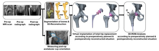The computational framework for the preoperative calculation of the patient-specific range of motion (ROM) after subjection to virtually performed total hip arthroplasty. Note that the postoperative radiograph is solely used to generate the postoperatively reconstructed situation, which is intended to be used to compare the ROM with the preoperatively planned situation. Therefore, this is not necessary for the intended framework, i.e., the estimation of the postoperative ROM during preoperative planning based on MRI data.