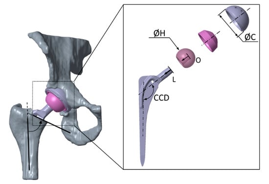 - Kluess, D.; Martin, H.; Mittelmeier, W.; Schmitz, K.-P.; Bader, R. Influence of femoral head size on impingement, dislocation and stress distribution in total hip replacement. Med. Eng. Phys. 2007, 29, 465–471. [Google Scholar] [CrossRef]