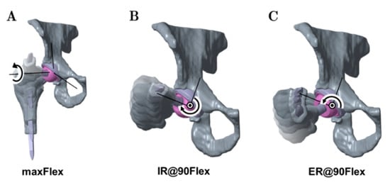 Generally, the motion was started at the initial configuration for each load case and continued until impingement [23,63] was detected. In our approach, impingement between femoral configuration—consisting of the femoral bone, stem, and prosthetic head—and pelvic configuration—consisting of the pelvic bone, acetabular cup, and liner—was recognized. The definition of contact in this algorithm is the occurrence of the intersection between pelvic and femoral configuration. The hip joint angle at this specific position was then recorded as the functional ROM of the THR. Within the ROM analysis, three different movements similar to ISO-21535 and typical clinical joint movements [54,55,56,57] were considered (Figure 3): maximum flexion from neutral (maxFlex), combined internal rotation at 90° flexion (IR@90Flex), and combined external rotation at 90° flexion (ER@90Flex).