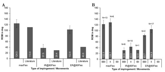 Comparison of the range of motion using implantation according to preoperatively planned situation for each patient (n = 19) during maximum flexion (maxFlex), internal rotation at 90° of flexion (IR@90Flex), and external rotation at 90° flexion (ER@90Flex). (A) Mean range of motion with standard deviations until impingement during the three movements. Physiological ROM are represented from literature studies for maxFlex and IR@90Flex [18,64], and ER@90Flex [54]. (B) Quantity N of impingement type (BBI, bone-to-bone-impingement; II, implant-to-implant-impingement; IBI, implant-to-bone-impingement).