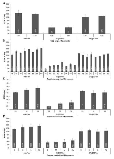 Results of the ROM analysis depending on implant-specific design parameters during maximum flexion (maxFlex), internal rotation at 90° flexion (IR@90Flex), and external rotation at 90° flexion (ER@90Flex): (A) CCD-angle; (B) acetabular cup size; (C) prosthetic head size; (D) prosthetic head offset.