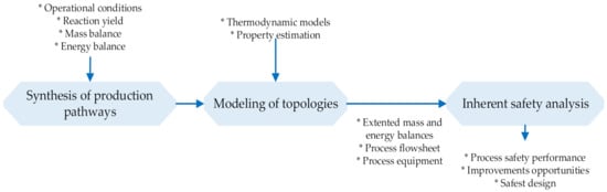 In this study, the inherent safety of three emerging microalgae-based biodiesel production topologies is evaluated: lipid extraction and transesterification method, in-situ transesterification, and hydrothermal liquefaction. The processes were designed based on information reported in the literature including operational conditions, reactions conversion, and mass and energy balances, among others. The technical data obtained from the process synthesis were used to perform the modeling of topologies studied. Modeling provided the extended mass and energy balances required to perform the safety analysis. Finally, the safety analysis allowed determining the process performance from the process safety perspective, identifying improvement opportunities, and selecting the safest design. Figure 1 shows the methodology by stages applied in this work.