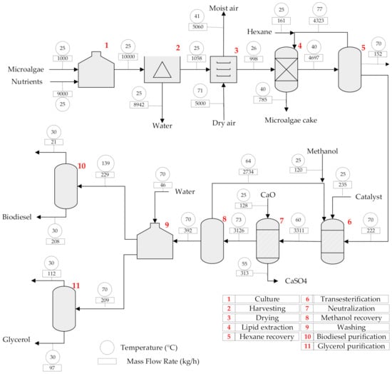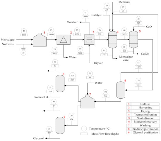 The production of biodiesel from microalgae by in situ transesterification method is shown in Figure 3. Microalgae (1000 kg/h) and nutrients (9000 kg/h) are fed into the system in the first stage where the biomass is cultivated. Then, microalgae are harvested by centrifugation and sent to a drying process to remove excess moisture. The dry biomass goes to the next step, where the lipid extraction and transesterification are carried out using methanol and sulfuric acid as a catalyst in a molar ratio of methanol: lipids and catalyzer: lipids equal to 12:1 [48] and 1:1 [49], respectively. From this unit, the carbohydrate and protein-rich phase is discarded, while the biodiesel and the glycerol-rich stream is sent to the neutralization stage. In the neutralization step, calcium oxide is added to neutralize the catalyst; calcium sulfate and water leave this unite as waste.