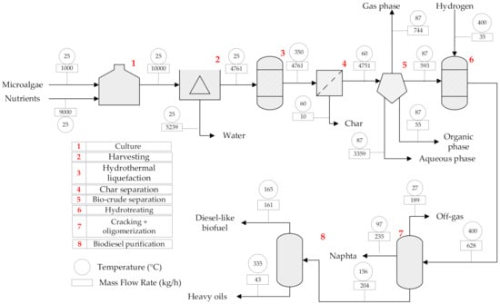 Microalgae (1000 kg/h) are fed into the cultivation stage combined with 9000 kg/h of nutrients and subsequently harvested by centrifugation (see Figure 4). The harvested biomass is sent to the next stage where the hydrothermal liquefaction reaction is performed at 200 bar and 350 °C [42]. Under these conditions, the macromolecules found within the algal biomass (including lipids, proteins, and carbohydrates) suffer depolymerization reactions (fragmentation, hydrolysis, dehydration, deoxygenation, aromatization, and repolymerization) [52], which leads to a three-phase product stream: liquid, solid and gaseous. Then, the mainstream from the HTL reactor enters the solids separation unit where ashes and carbon (CHAR) are separated and discarded. The liquid, gas, and organic phases are then separated, and the bio-crude is obtained. Bio-crude derived from thermochemical biomass conversion is a heavy organic liquid with a relatively high oxygen content, which is transformed into a conventional hydrocarbon fuel by hydrogen treatment in the hydrotreating stage [53]. In the hydrotreating unit, reactions occur at 400 °C and 100 bar [42], and hydrogen consumption is 13% of the bio-crude mass flow [54]. The hydrocarbon mixture subsequently undergoes the cracking and oligomerization stage where it is fractionated into three boiling points: C4 minus (off-gas) range, naphtha range, and heavy oil range. The latter is subjected to a distillation process to obtain pure diesel-like biofuel (160.9 kg/h).
