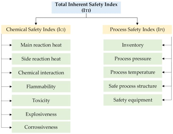 The chemical safety index and the process safety index are determined as shown in Equations (15) and (16), considering the sum of the subindices related to the criteria mentioned in Figure 5.