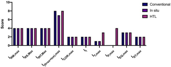 For the IRS,max metric, the side reactions for the first (conventional) and second (in situ transesterification) topologies were identified in the neutralization stage where the acid catalyst is neutralized by adding CaO (see Equation (13)). The reaction shows exothermic behavior releasing heat of −6768 j/g; hence, a score of two is assigned for both topologies. The side reactions for the third topology (HTL) correspond to hydrotreating the HTL stream to produce hydrocarbon fuels, which also showed to be exothermic.