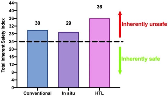 Similar studies related to biodiesel production from residual biomass confirm the low performance of these processes from a safety perspective. The inherent safety assessment of biodiesel production from waste oil revealed that the process is unsafe, indicating that the amount of chemicals and their flammability characteristics represent the main hazard along the route [59]. The emerging risk analysis for a bio-diesel production process by transesterification of virgin and renewable oils concluded that the topology is highly unsafe and identified that the main risk is associated with methanol fire and explosion [60]. Furthermore, processes for other types of biofuels production showed inherently unsafe performance, such as a biorefinery for ethanol, butanol, succinic acid, among others, from lignocellulosic biomass that exhibited an ITI = 36 [61].