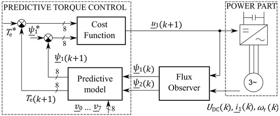 Within a two-level voltage-source inverter, eight fundamental switching combinations corresponding to six active and two passive voltage space vectors can be generated. These voltage vectors form a feasible set for the predictive control inputs. The application of one of the vectors to the motor terminals influences the controlled quantities—the stator flux amplitude and the developed torque, in a specific way. The PTC aims to predict the effect of each voltage vector for the next sampling time. Furthermore, these effects are evaluated according to the predefined criteria by the so-called cost function. The most suitable candidate is then selected from the feasible set. The basic block diagram of the PTC of IM is depicted in Figure 5.