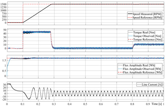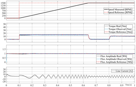 Figure 7 and Figure 8 show the startup of the motor connected to the star and delta, respectively, from 0 to 1500 RPM. The reference stator flux in the delta configuration was set to 1.7 Wb. Following Section 3.1, the stator flux in the star configuration had to be set to 1 Wb; otherwise, the drive would not be able to reach the reference speed. The speed controller torque limit in the star connection was set to one-third of the torque limit in the delta connection, where it represented 125 % of the nominal torque. Due to the flux and torque limitations in the star connection, the startup was faster for a delta winding configuration. However, in both cases, the control model’s estimated values coincided well with the actual values because the actual winding topology was respected in the control model.