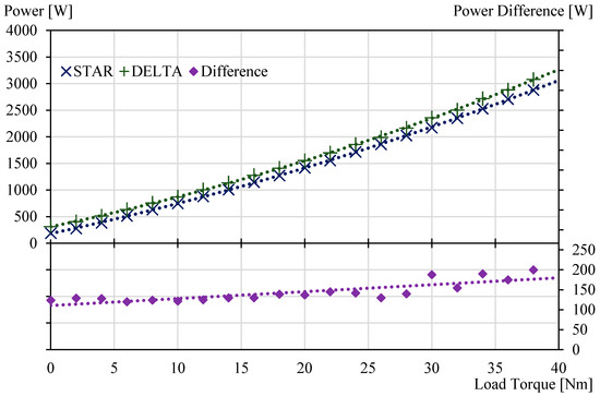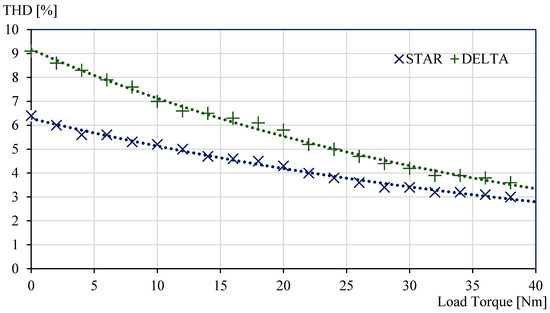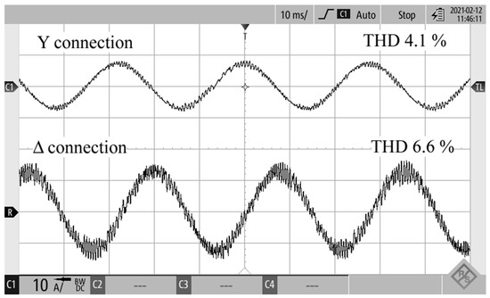 Table 2 shows a detailed comparison of current THD and electric power consumption for a delta and star winding connection. The input electric power was measured by NORMA 4000. The current THD was obtained from oscilloscope R&S RTH1004 using the current probe Tektronix A622. The THD was calculated as the ratio between the root mean square (RMS) of all distortion products (i.e., all the harmonics except the fundamental one) and the signal’s total RMS.
