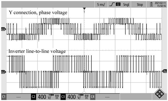 Figure 16 compares the motor phase voltage of a star-connected machine and the inverter line-to-line voltage (i.e., the motor phase voltage when the machine is delta-connected). In the case of star connection, the phase voltage took values , and V, while in the delta connection it took and V. The higher instantaneous peak phase voltage in the delta connection was the leading cause of the higher current and, consequently, flux and torque distortion.