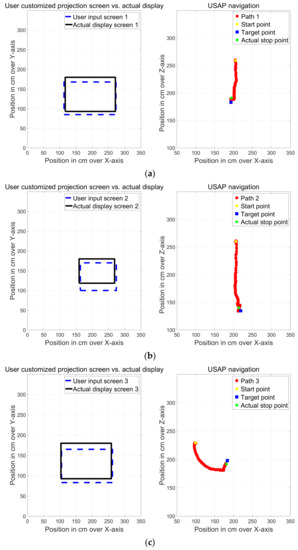 Customized screen accuracy and USAP platform navigation performance: (a) Customized screen 1 and USAP’s first path, (b) customized screen 2 and USAP’s second path, (c) customized screen 3 and USAP’s third path, and (d) customized screen 4 and USAP’s fourth path.