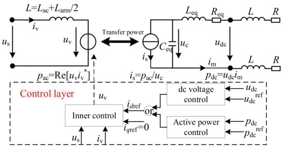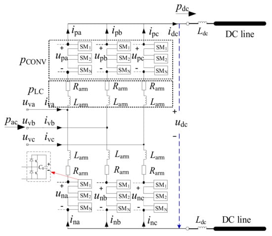 At any time instant, the instantaneous power pdc at the DC terminal is the sum of the instantaneous AC active power at the AC terminal pac, the instantaneous powers resulting from the derivative of energy of the phase reactors pL and the module capacitors pCONV. Here, the phase reactor losses and converter losses are neglected. The relationship could then be described in Equation (1):