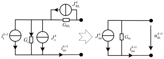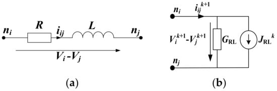 where, h is the time step. L is the inductance of the branch; R is the resistance of the branch. The superscript k indicates the current step, and the superscript (k + 1) indicates the next step. i is the branch current. V is the node voltage. GRL is the equivalent admittance, and JRL is the equivalent current source.