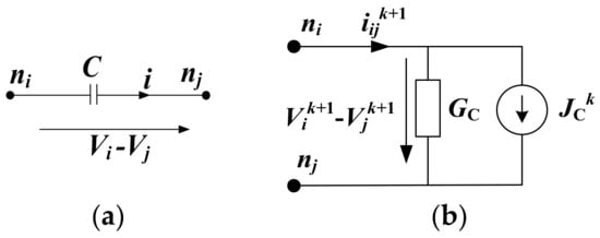 The characteristic of discrete adjoint model is that the lumped parameter element is converted into a parallel connection of an admittance and a current source according to the state of its history voltage and current. Thus, a circuit network originally described by differential-algebraic equations could be transformed into a network that could only be described by algebraic equations [].