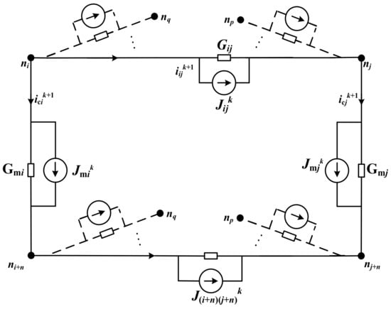 Here, V means the node voltage. The symbol ∈ means that the two nodes are connected to each other. Gij and Jij are the equivalent admittance and the equivalent current source of line lij. The other symbols have been defined above.