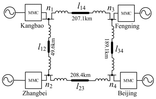The test system adopted in this paper is the Zhangbei ±500 kV four-terminal bipolar DC grid in china. Its schematic diagram is illustrated in Figure 7. Kangbao, Zhangbei, Fengning and Beijing converter stations are abbreviated as s1-s4. Parameters of the Zhangbei DC grid are listed in Table 1. Generally, due to the delay of the communication system, the converters receive the blocking signal and then execute the blocking command with a delay of several cycles. Considering the factors such as short-term DC withstand voltage and thermal stress tolerance, the delay should generally not exceed 10 ms. This paper is suitable for estimating the fault characteristics prior to the blocking, but unfortunately the blocking of MMCs cannot be modeled. Therefore, an identical calculation step of 10 ms and time step of 50 us is set for the EMT simulation performed on PSCAD and the presented method performed on MATLAB.