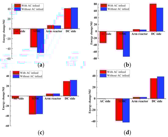 According to the analysis of power transfer among the AC side, DC side and MMC’s internal components, the influence of the AC active power on the fault currents and voltages could be studied. Based on Equations (23)–(26), the energy changes of the DC side, MMC internal components and AC side of each converter station within 10 ms after the fault occurs with and without AC infeed are shown in Figure 8.