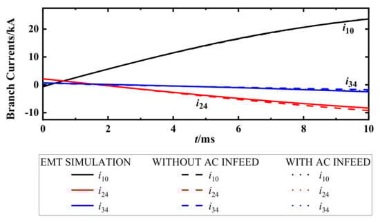 It could be seen from Figure 9 that the branch currents coincide with those computed by the EMT simulation. This is achieved by including the MMC control into the AC output voltage of MMC. The proposed method also shows good accuracy in the unfaulted branch currents i24 and i34 especially at 5–10 ms after the fault since the controller takes effect at this time.