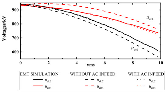 From Figure 10, it could be seen that there are evident errors in estimating node voltages if AC infeed is not considered. For sending end converter station s2, the voltage udc2 decreases much faster than the proposed method. For receiving end converter station s4, the voltage udc4 firstly rises to some extent and then decreases. This is because the AC side releases the power required by the DC side for the sending end and plays the role of absorbing and releasing power flowing into the converter station for the receiving end. Since all MMC controllers are represented by variable controlled current sources, the proposed method shows sufficient accuracy in estimating the node voltages.
