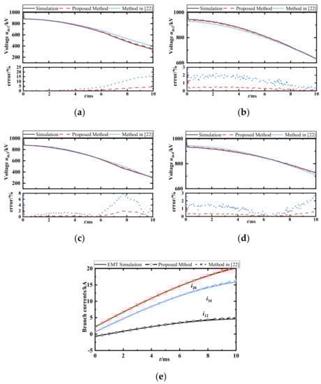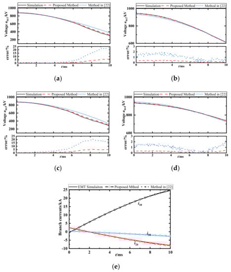 It is assumed that the system has already been in steady-state. At t = 0 ms, a pole-to-pole fault occurs on the line side of s4 at line l24. The results and errors obtained by simulations, the proposed method and the methods in [,] are shown in Figure 12.