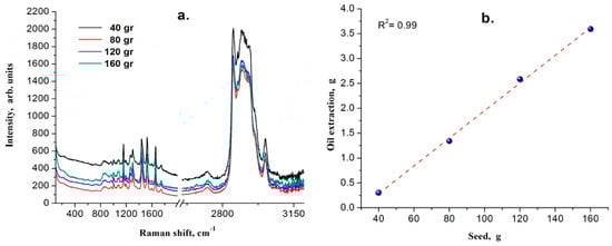 Raw Raman spectra recorded. (a) Average Raman spectra recorded for each batch of oil extracted with different amount of seed. (b) The weight ratio between the processed seed versus extracted oil shows a linear tendency.