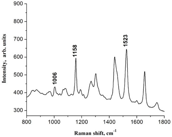 Region of the Raman spectrum of an oil sample from Sondias mombin L. where Raman frequencies are located at 1006, 1158 and 1523 cm−1, which are associated with carotenoids compounds.