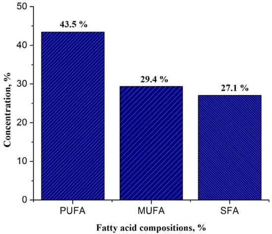 The olefinic protons for all unsaturated fatty acids appeared at δ 5.30–5.41 ppm. In the low-field region of the spectra, a multiplet at δ 5.25–5.29 ppm was assigned to the proton attached to C-2 of the glycerol. The chemical shifts and multiplicities of coupling constants for the signals at δ 4.14–4.19 ppm (J1 = 9 Hz, J2 = 6 Hz, dd) and δ 4.29–4.33 ppm (J1 = 9 Hz, J2 = 3 Hz, dd) are characteristic for H-1 and H-3 protons of glycerol system. Bis-allylic and allylic proton signals appeared as a triplet at δ 2.77–2.80 ppm (J = 3 Hz) and a complex multiplet at δ 2.00–2.09 ppm. A triplet at δ 2.31–2.37 ppm (J = 6.0 Hz) was designated to methylene H-2 protons adjacent to the acyl group, a multiplet at δ 1.59–1.66 ppm was assigned to H-3, while the other methylene protons appeared between δ 1.25 and 1.41 ppm. The terminal methyl protons appeared at δ 0.87–0.92 ppm. The downfield-shifted proton signal at δ 6.25 indicated the presence of linoleic acid [43]. The relative % of SFA, MUFA and PUFA present in the sample was calculated following the method described by Thoss et al. (Figure 3) [25].