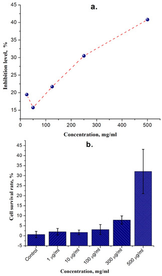 Some authors have shown antioxidant capacity for Spondias mombin L. pulp under certain conditions [49,50], and in this study we demonstrated a higher efficiency. Spondias mombin L. seed oil had concentration-dependent antioxidant activity as shown in Figure 4a, with a maximum ABTS• + radical inhibition of 45%.