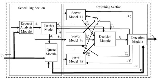 The scheduling section is composed of three modules—a request-analysis module, a service module, and a queue module.