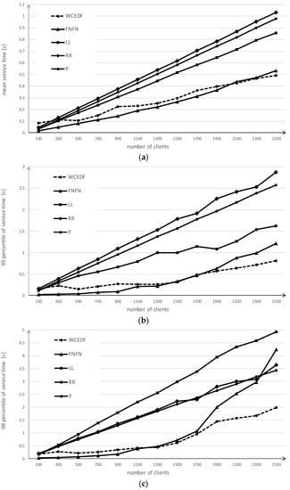 As it can be seen in Figure 6, when the load of the system was low, the mean response time, the 95 percentile, and the 98 percentile were the lowest for the FNFN configuration. The FNFN configuration was very effective in minimizing HTTP request service times. When the load increased, the 95 and the 98 percentile became lower for the WCEDF strategy. This was especially noticeable in the case of the 98 percentile. The WCEDF strategy was able to keep the service time within constraints () when the load was low and keep the time as low as possible when the load increased. The FNFN configuration in heavier loads had lower mean service times. However, there are also requests with long service times, which is noticeable on the 98 percentile graph. The same phenomenon can be seen on the cumulative distribution of the service time graph (Figure 6d), picturing results for the load of 2300 clients. About 80% of requests were serviced by the FNFN cloud in a time shorter than for the WCEDF method. However, the longest 20% of service times also belonged to the FNFN configuration, which indicates that the standard deviation was greater for the FNFN than for the WCEDF. The WCEDF method, in most cases, offered a longer mean service time, but the flow of requests was much more predictable, structured and in the end, there are not requests being serviced for a longer time.