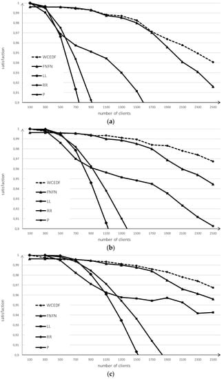 To evaluate the experiments’ results, different metrics were used—mean service time, 95 percentile, and 98 percentile of service time. One of the WCEDF method’s main aims is to service the requests in a time shorter than the required value . The new proposed approach requires the application of an adequate quality factor, allowing evaluation of the most important features of the proposed method. The mean value of satisfaction was chosen. It is often used to evaluate the effect of the work of real-time soft systems.