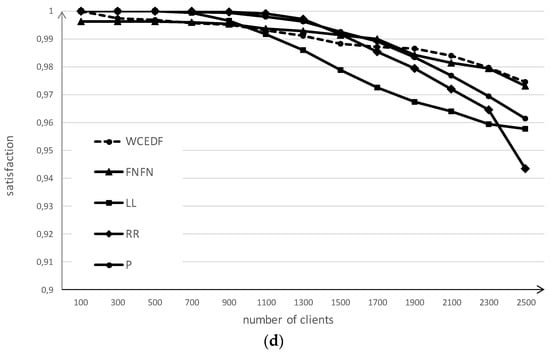 Figure 7 presents graphs of satisfaction for different obtained times . As can be seen, the satisfaction was the highest for the WCEDF method, especially when the load was heavy. When the load was low, the measured satisfaction was high and close to 1 for each of the distribution strategies and methods in each experiment. The strategies LL, RR, and P, obtained poor results for a heavier load, especially for shorter times equal to 0.5 s and 0.75 s. The satisfaction for the WCEDF method was close to other distribution strategies in experiments with . In this case, obtained results were good because the constraints were not narrow and easy to achieve even for not-intelligent, classical strategies.