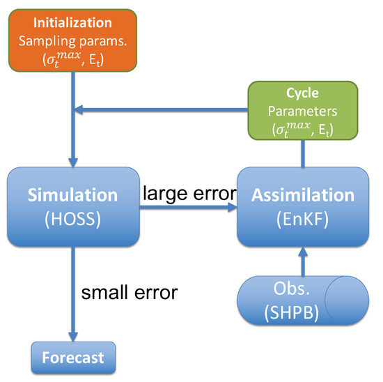 Data assimilation cycle for HOSS with EnKF for estimating key model parameters. The default parameters are passed to HOSS. If the error between the model output against observations is large, then the assimilation is performed, which provides new parameter values. The assimilation cycle is performed until the error between the model output and observations is small enough (a certain tolerance).